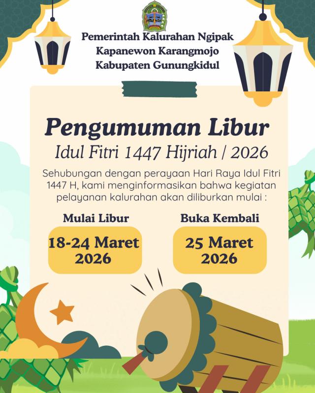 NGIPAK (SIDA). Menyongsong datangnya Hari Raya Idul fitri 1447 Hijriah, Pemerintah Kalurahan Ngipak menyampaikan pengumuman resmi terkait penyesuaian jadwal pelayanan administrasi masyarakat. Hal ini dilakukan guna memberikan kesempatan bagi seluruh jajaran pamong dan staf kalurahan untuk merayakan hari raya bersama keluarga.